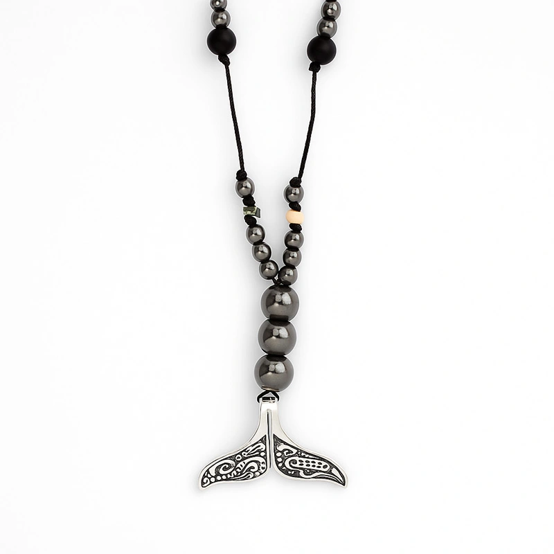 Κολιέ σε σχοινί από ορυκτές πέτρες και σχέδιο ουρά φάλαινας από ασημί ανοξείδωτο ατσάλι