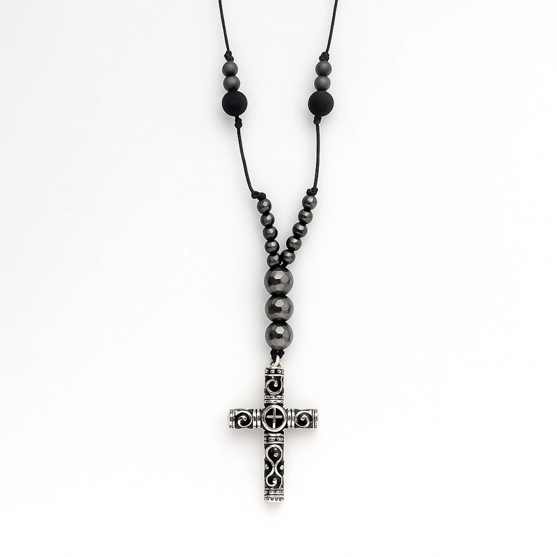 Κολιέ σε σχοινί από ορυκτές πέτρες και σταυρό από ασημί ανοξείδωτο ατσάλι
