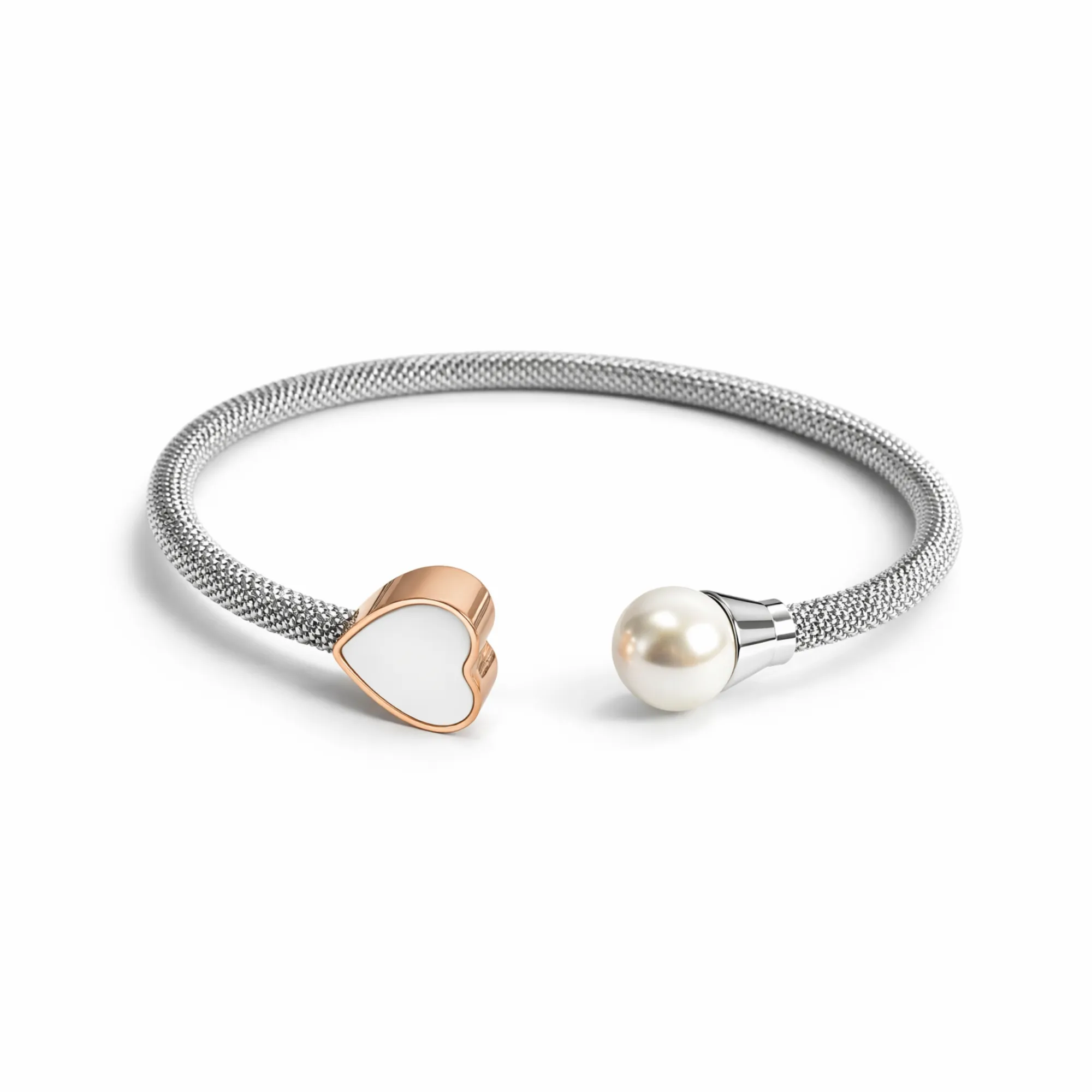 Ασημί Χειροπέδα “Mesh Twist” με Χρυσή Καρδιά και Πέρλα