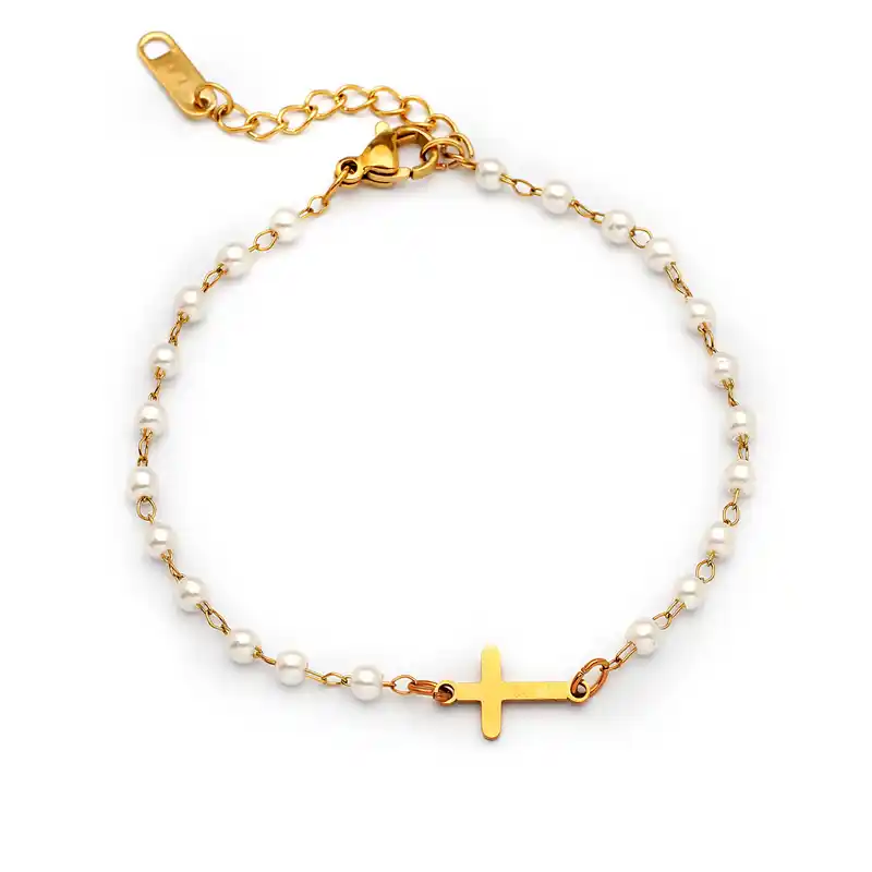 Επιχρυσωμενη αλυσιδα απο ατσαλι 304 με λευκες περλες και επιχρυσωμενο σταυρο