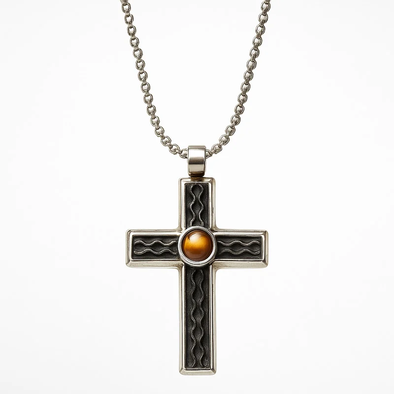 Σταυρός από μαύρο ανοξείδωτο ατσάλι και ορυκτή πέτρα Tiger Eye στο κέντρο